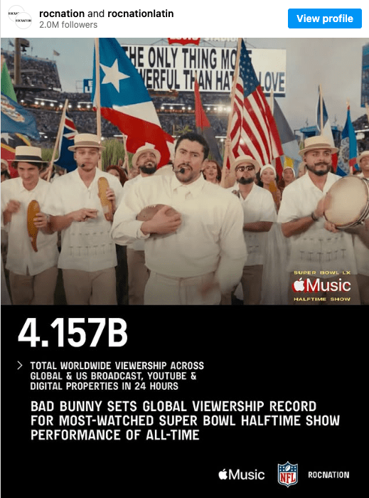 The NFL’s top three most-viewed social posts of all time now all come from the Bad Bunny halftime show. One clip, “Only Thing More Powerful Than Hate Is Love,” reached 179 million views on Instagram, making it the most-viewed clip on NFL social media ever.